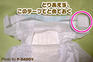 マジックテープは、オムツの背中部分の端っこを、締めることを意識しながら、逆ハの字に引き下げながらとめる!