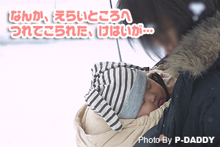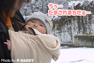 最近のお出かけ時の必需品、ベビー ビョルンの抱っこ紐にコートも着けて、
